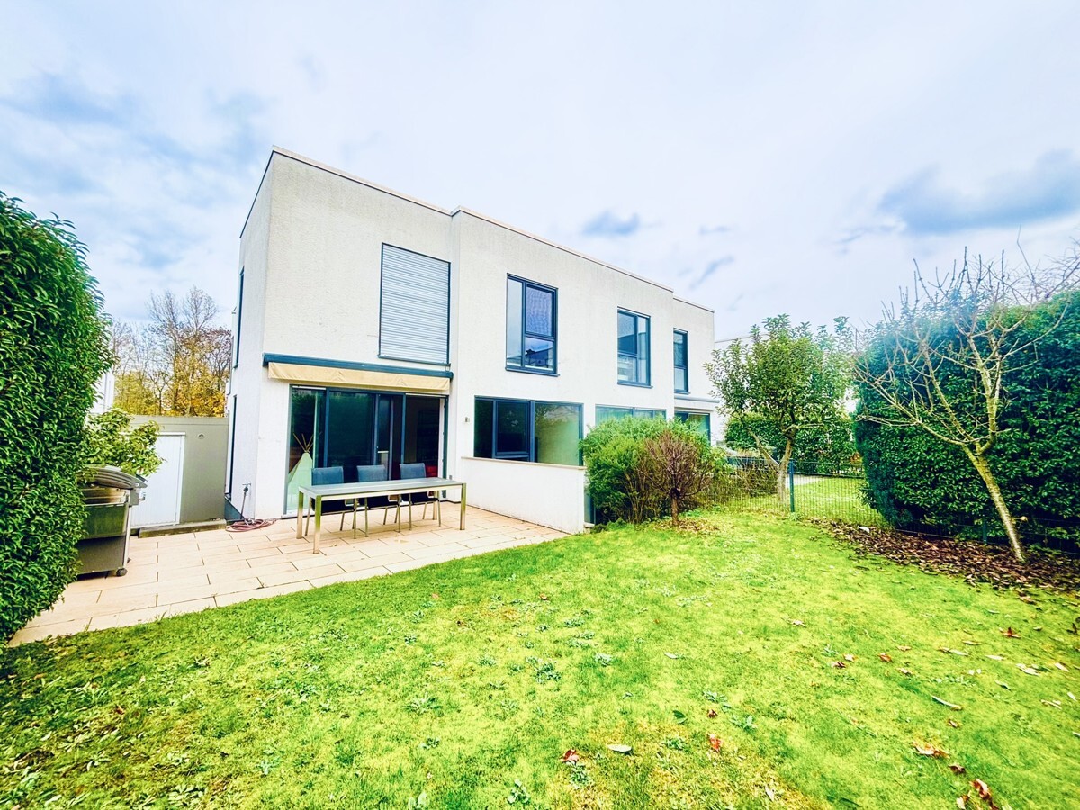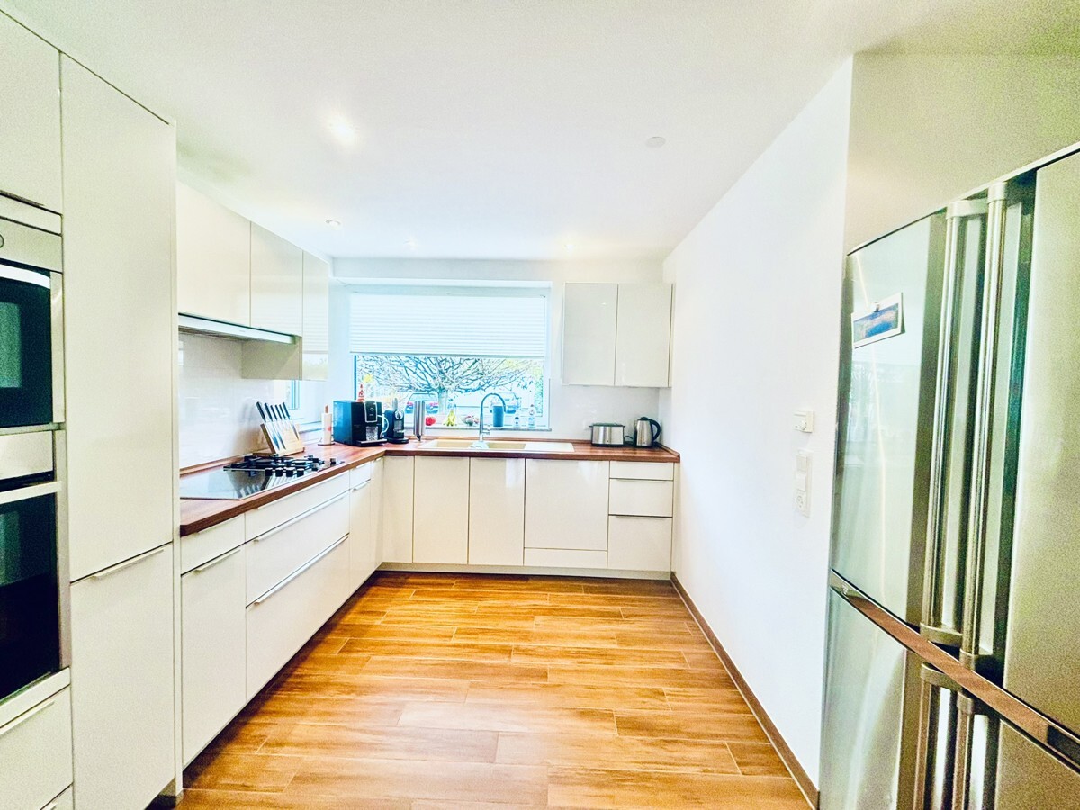 Size: approx. 200 sqm (2153 sqft) + 37 sqm (398 sqft) storage / laundry room Plot size: approx. 265 sqm (2852 sqft) Living-dining room: 1 Bedrooms: 4 + built-in closet Bathrooms: 3.5 (2x shower and 1x tub) Fitted kitchen with appliances: dishwasher, oven, fridge & freezer, stove, hood Basement: guest room + bath + 2x storage + laundry / heating room Parking: garage + 1 parking spot on site Floor: parquet floor & tiles Appliance: el. blinds, el. awning, light fixtures, PV system, built-in closet Heating: central gas heating / floor heating Outdoor: small, fenced yard, terrace Pet’s allowance: no Deposit: 2 cold rents American housing contract welcome!