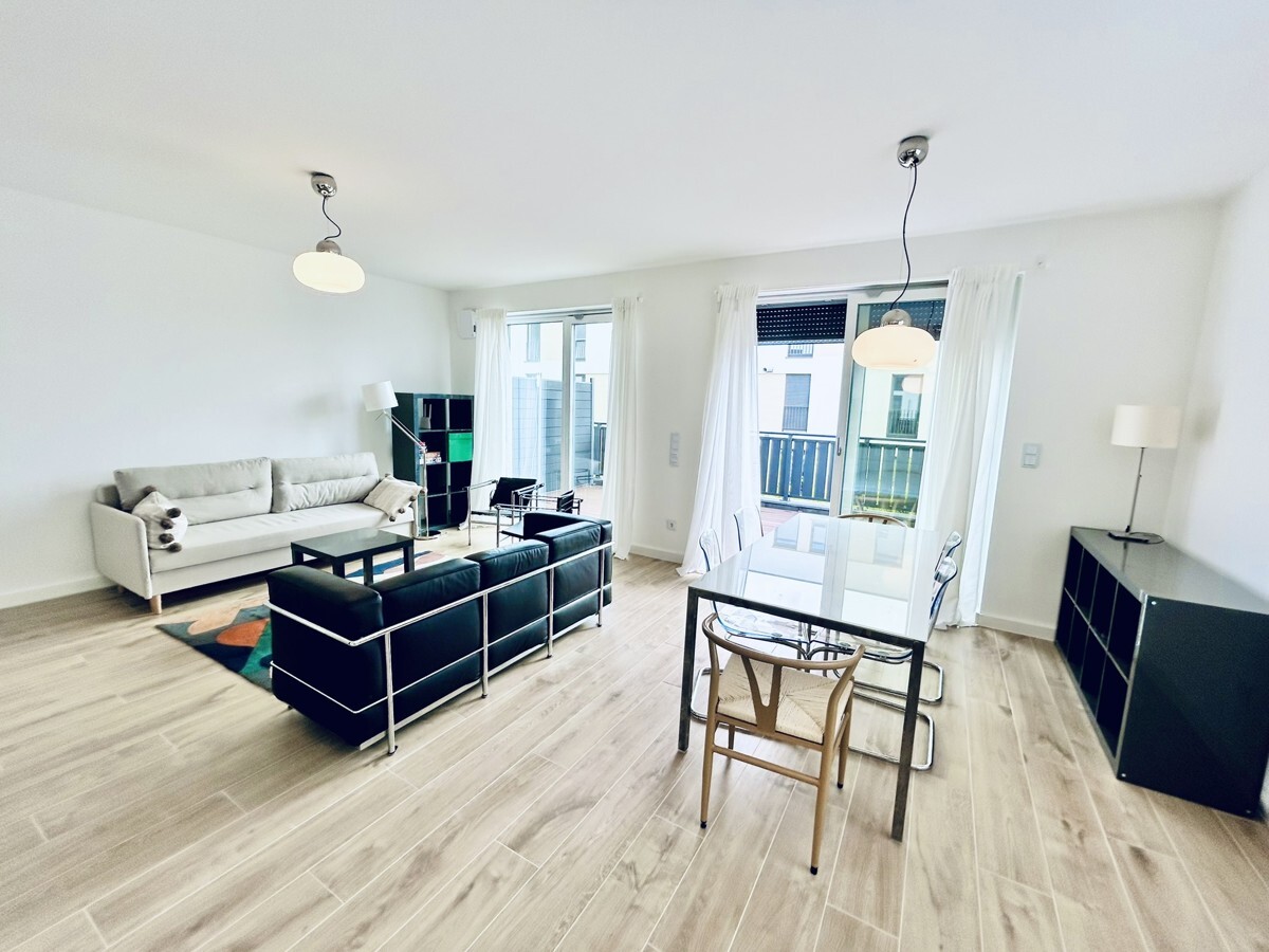 Size: 75 sqm (807 sqft) Living / dining room: 1 New fitted kitchen with appliances: stove, oven, hood, fridge and freezer, dishwasher Bedrooms: 1 Bathrooms: 1 (1x shower & tub) Floor: high quality ceramic tiles Appliance: el. shutters, mirror in the bathroom, all rooms with lights fixtures, Heating: floor heating / source efficient air-heat-pump / ventilation system Terrace: 21 sqm (226 sqft) Parking: 1 parking spot (50€/month) Internet: (200 Mbit/s) Storage: small storage / laundry with hook-up for washer & dryer Pet’s allowance: negotiable Deposit: 2 cold rents American housing contract welcome