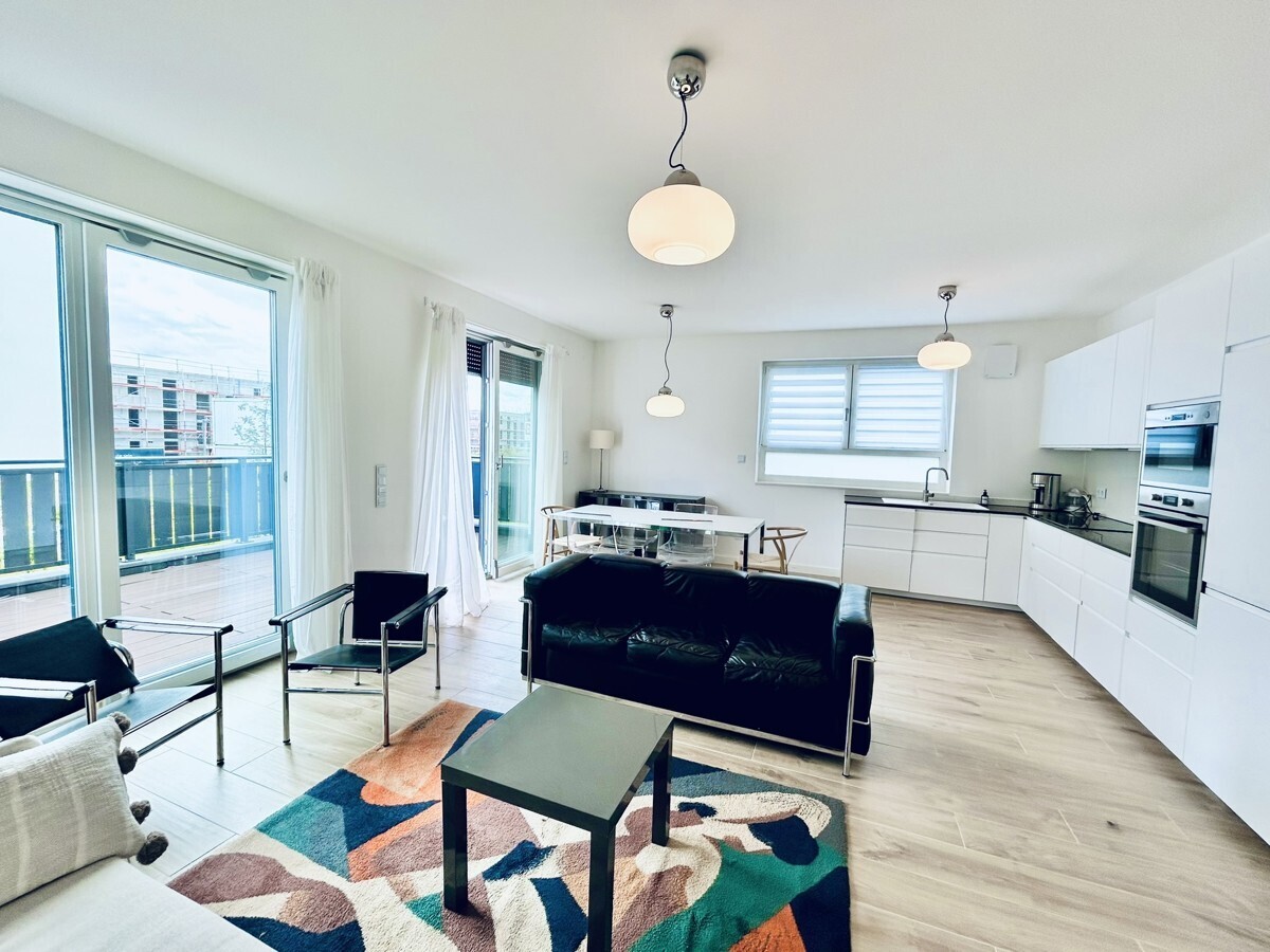 Size: 75 sqm (807 sqft) Living / dining room: 1 New fitted kitchen with appliances: stove, oven, hood, fridge and freezer, dishwasher Bedrooms: 1 Bathrooms: 1 (1x shower + tub) with washer-dryer Floor: high quality ceramic tiles Appliance: el. shutters, mirrors in the bathroom, lights fixtures, Heating: floor heating / source efficient air-heat-pump / ventilation system Terrace: 21 sqm (226 sqft) Parking: 1 parking spot incl. Internet:: (200 Mbit/s) Storage: small pantry for storage Pet's allowance: negotiable Deposit: 2 cold rents American housing contract welcome