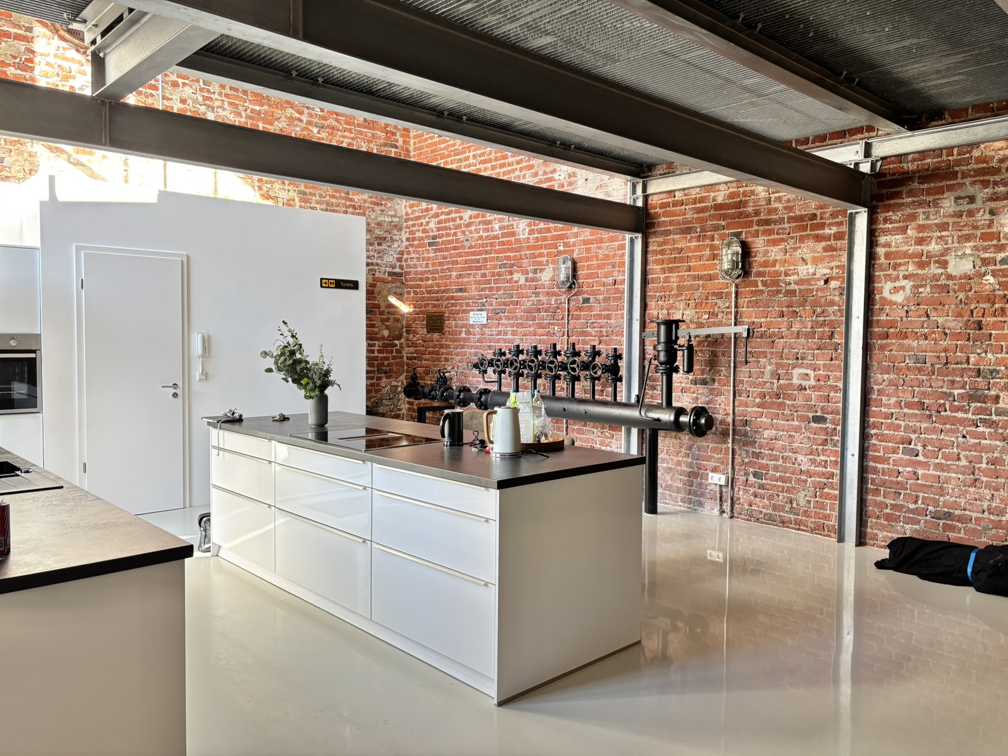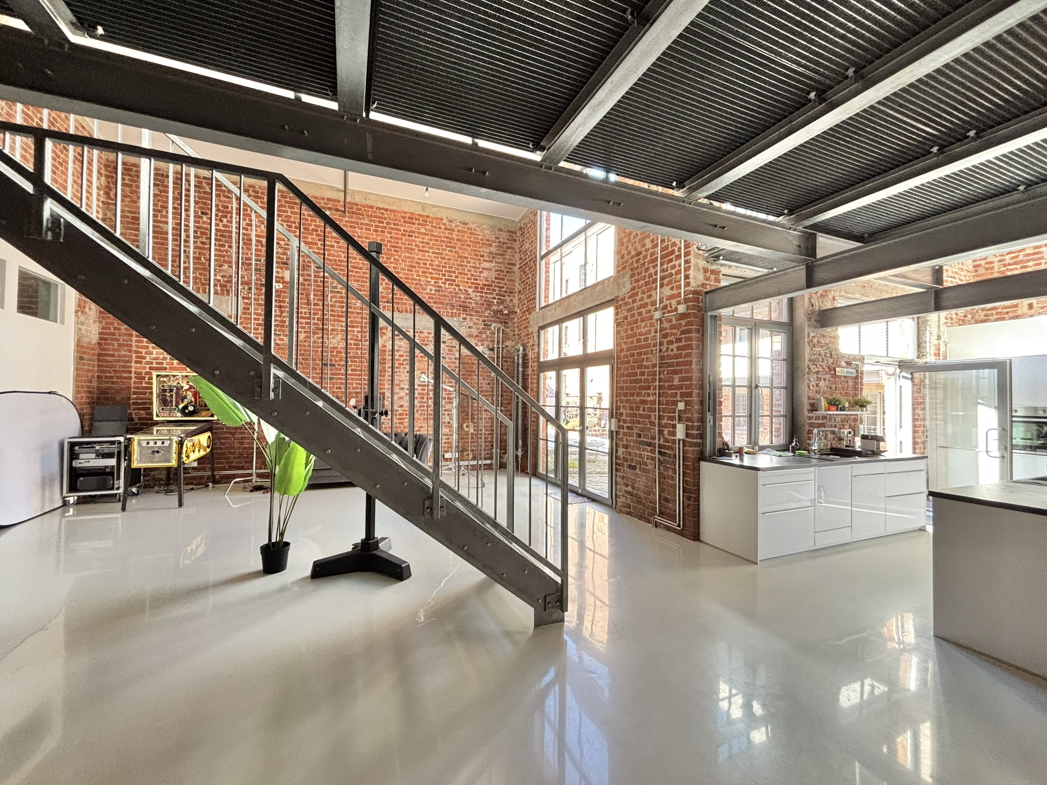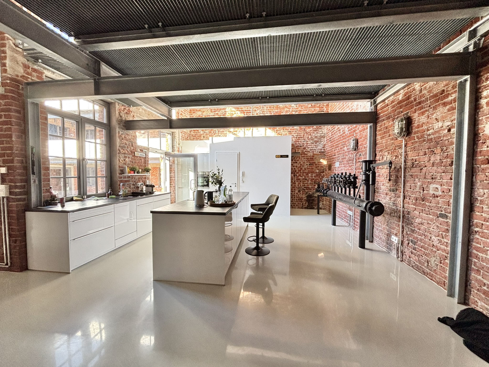 Features: ✅ Open-plan living & dining area: ~100 sqm, perfect for entertaining ✅ Bedroom with walk-in closet/dressing room + office / 2nd bedroom (galery) ✅ 1,5 unique bathrooms (shower) ✅ Modern open kitchen with premium appliances, combining style and functionality ✅ Laundry & storage area ✅ Industrial character: preserved and painted original ceilings ✅ Flooring: modern epoxy resin coating (stylish & easy to maintain) Heating: underfloor heating (gas, installed 2017) ✅ Private terrace/patio Details: ✅ Rent: €2,600 cold + €500 utilities = €3,100 warm ✅ Deposit: 2 months cold rent ✅ Year Built: 1930 | Fully renovated 2017 ✅ Living Space: 196 sqm (2,110 sq ft) ✅ Bedrooms: 1 with walk-in closet + open gallery space for office or 2nd bedroom Bathrooms: 1.5 (1 full, 1 shower) ✅ Balcony/Terrace: available ✅ Additional Storage: available Parking: optional (€50/month) ✅ Energy Certificate: EPC rating G (255 kWh/m²*a) ✅ US Housing Contract: accepted